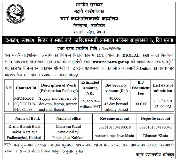 डेस्कटप ल्यापटप प्रिन्टर र स्मार्ट बोर्ड खरिद सम्बन्धी अनलाइन कोटेसन आह्वानको १५ दिने सूचना ।