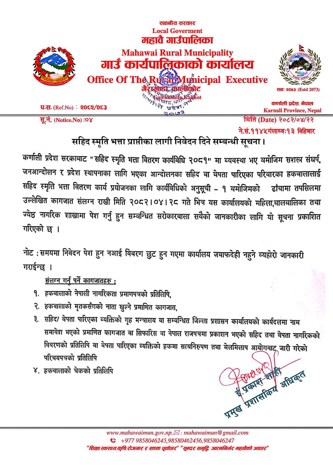 सहिद स्मृती भत्ता प्राप्तीका लागी निवेदन दिने सम्बन्धी सूचना ।