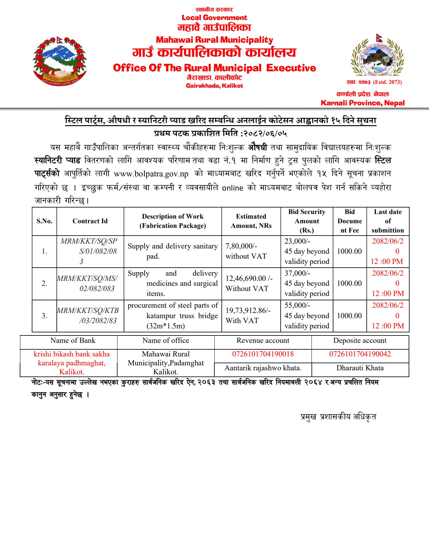 स्टिल पार्टस, औषधी र स्यानिटरी प्याड खरिद सम्बन्धि अनलाइन कोटेसन आह्वानको १५ दिने सूचना ।